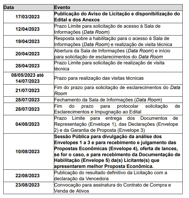 O leilão está previsto para 10 de agosto deste ano e o valor mínimo para o lote é de R$ 48,2 milhões. A lista com a descrição dos ativos pode ser consultada aqui.