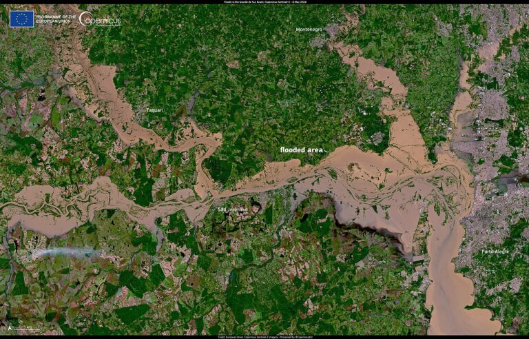 Imagem de satélite das áreas ao redor de Porto Alegre inundadas em 2024